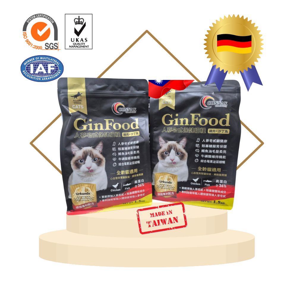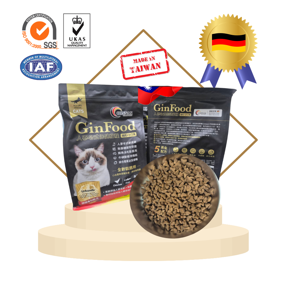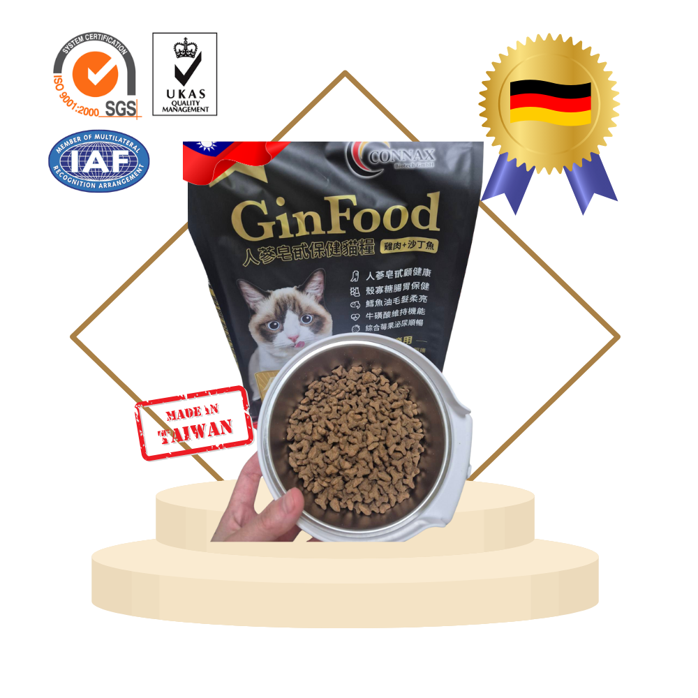GinFood 貓糧 低敏人參保健 鷄肉+沙丁魚 RH2 人蔘皂苷|小分子寡糖(益生元)|MIT 台灣製造